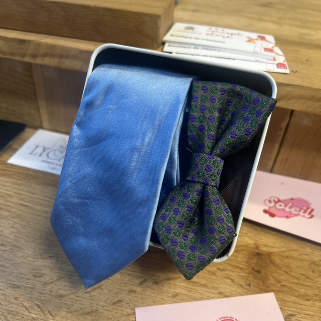 Très beau coffret composé d’une cravate bleu ciel et d’un beau noeud papillon tous les deux en 100% soie 🦋